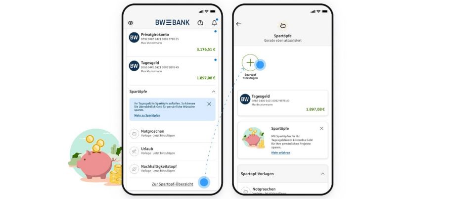 Ja, die Spartöpfe lassen sich ganz einfach in der App BW-Bank anlegen. Dort können Sie Ihre Spartöpfe einsehen, verwalten, umbenennen oder Geld zwischen den Töpfen und dem Tagesgeldkonto verschieben – einfach und mobil.