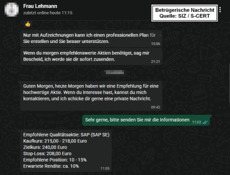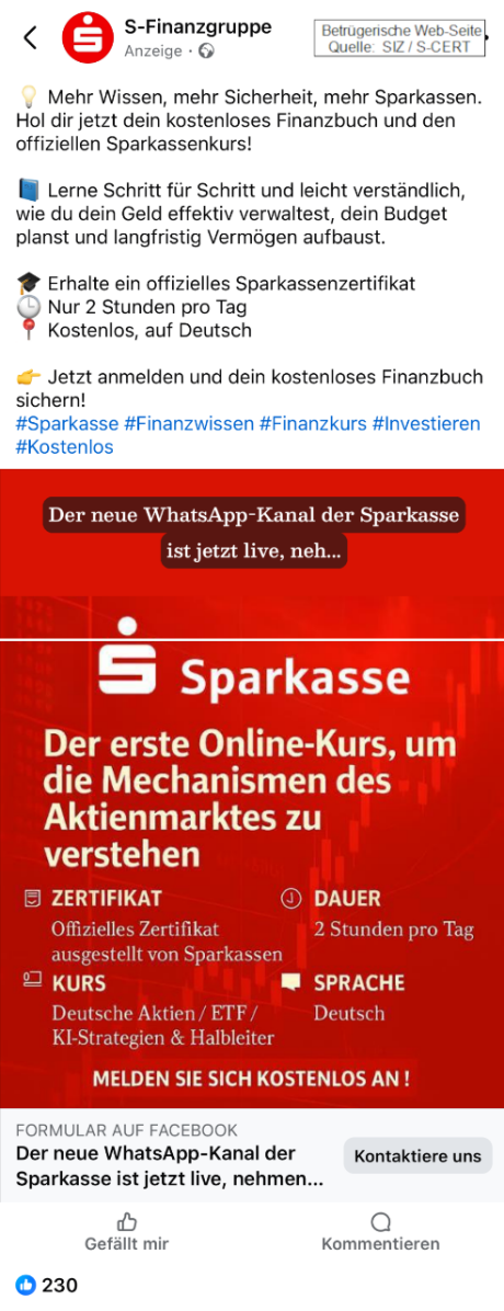 Aktuell werden auf Social-Media-Plattformen wie Instagram und Facebook vermehrt gefälschte Sparkassen oder andere Bank-Accounts mit täuschend echten Logos und leicht veränderten Namen erstellt, sowie betrügerische Werbeanzeigen veröffentlicht. Die Betrüger sprechen Sie gezielt mit vermeintlich attraktiven Anlageangeboten an. In der Folge werden Sie in WhatsApp-Gruppen mit einer hohen Anzahl von Teilnehmern eingeladen. In den Gruppen werden über Wochen angebliche Tipps und Marktanalysen geteilt, um Ihr Vertrauen zu gewinnen. Nach einiger Zeit fordern die Täter Sie dazu auf, auf einer angeblich professionellen Handelsplattform Geld zu investieren. Diese Plattformen wirken seriös, sind aber nur zum Zweck des Betrugs eingerichtet – Auszahlungen sind nicht möglich.