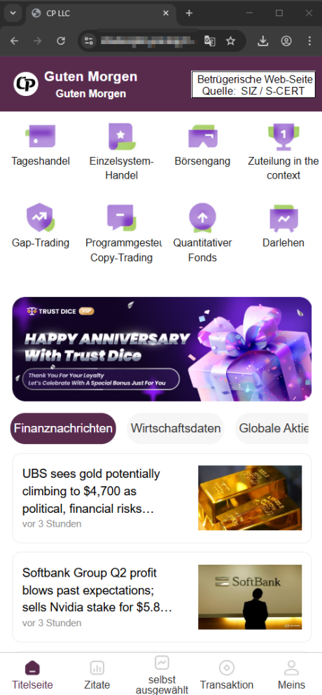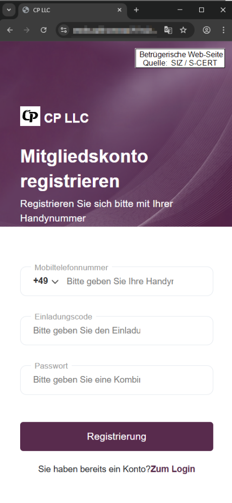 VORSICHT: Bitte geben Sie keine Daten auf den Phishing-Seiten ein. Diese könnten von Betrügern z. B. für betrügerische Transaktionen genutzt werden.