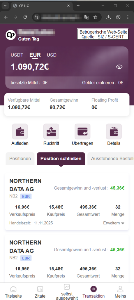 VORSICHT: Bitte geben Sie keine Daten auf den Phishing-Seiten ein und laden Sie keine Kopie Ihres Personalausweises hoch. Diese könnten von Betrügern z. B. für betrügerische Telefonanrufe bei Ihnen genutzt werden.