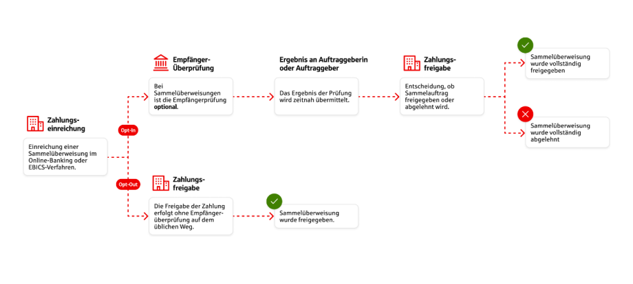 Als Auftraggeberinnen oder Auftraggeber einer Zahlung können Sie bei Sammelüberweisungen und Sammel- Echtzeitüberweisungen wählen, ob eine Empfängerüberprüfung durchgeführt werden soll (Opt-In) oder ob Sie darauf verzichten (Opt-Out). Prüfen Sie daher intern, ob Sie die Empfängerüberprüfung nutzen und wie Sie mit den Ergebnissen umgehen möchten.