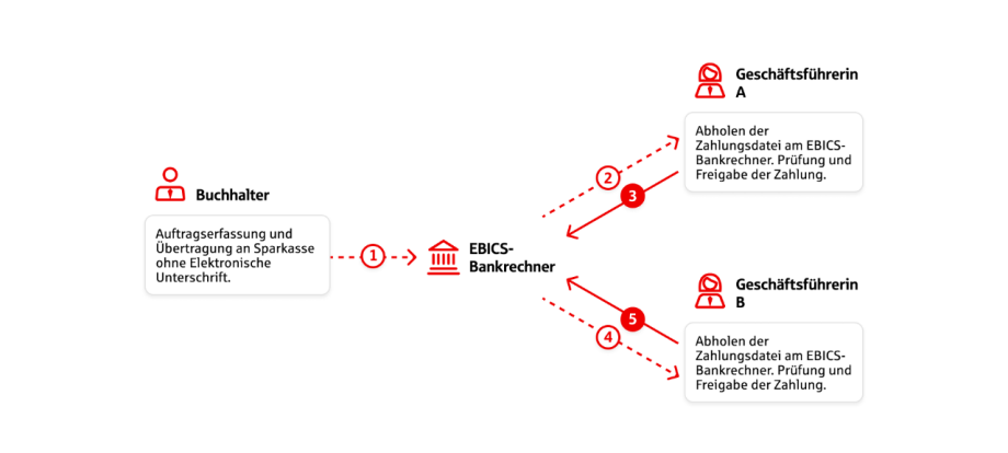 Die Funktionsweise der VEU bei gemeinschaftlicher Vertretungsberechtigung mit orts- und zeitunabhängiger Freigabe an einem Beispiel: